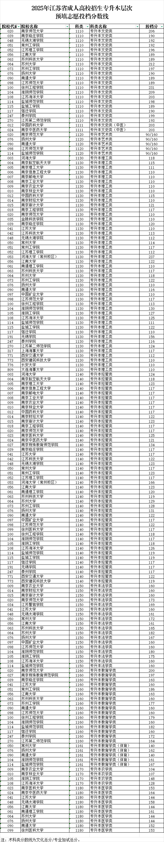 2025年江苏省成人高校招生专升本层次预填志愿投档分数线