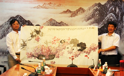 座谈尾声,吉林大学珠海学院董事长兼党委书记廖立国送上一幅名师画作——《硕果累累》,献礼华工广州学院建校十周年。华工广州学院校长彭新一代表学校向对方赠送纪念品。