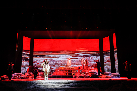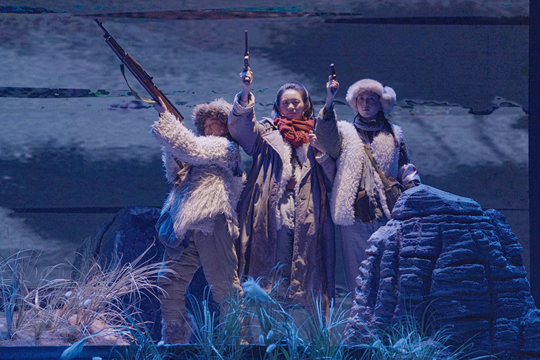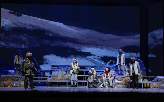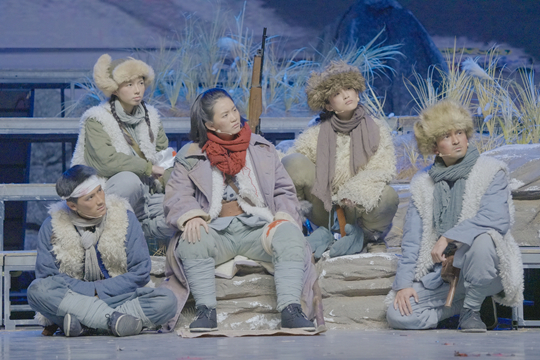 19时许,演出在风雪弥漫的舞台背景中拉开帷幕。话剧《风雪漫过那座山》以20世纪40年代初东北抗联战斗为背景,讲述了政委方梅带领六名战士在“神山”突围时的生死抉择。全剧采用复合叙事结构,将现实场景与心理片段交织,设置“记忆闪回”以强化人物心理,舞台设计用意象化的手法替代写实的战斗场面。演出中,演员们以扎实的表演功底全身心投入,以铿锵有力的舞台语言与张弛有度的肢体动作,精准表现了不同角色在面对生死之时的绝望、希望与坚毅,让每一位抗联战士形象立体鲜活,使观众穿越时空,真实感受到抗联战士所面临的艰苦卓绝的战争场景。当剧情展现至战士们互相搀扶、高喊革命口号的高潮段落时,现场响起了热烈的掌声。