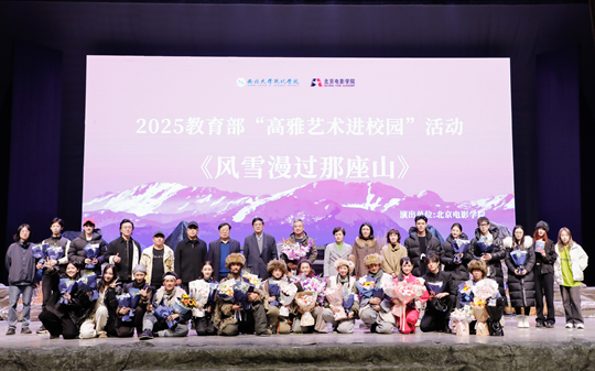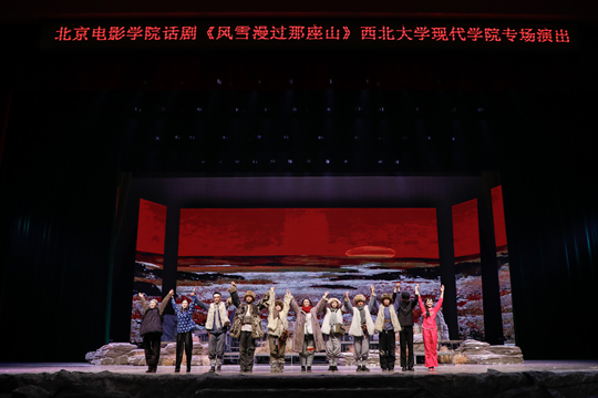 11月6日,教育部“高雅艺术进校园”2025年系列活动走进西北大学现代学院,在学校文体馆展演了由北京电影学院精心排练的大型红色话剧《风雪漫过那座山》。西北大学现代学院董事长刘家全等学校领导,著名演员赵思源、梁丽等嘉宾及陕西师范大学、长安大学、西北大学、西安外国语大学、西安翻译学院、西安外事学院等校师生代表上千人观看了演出。