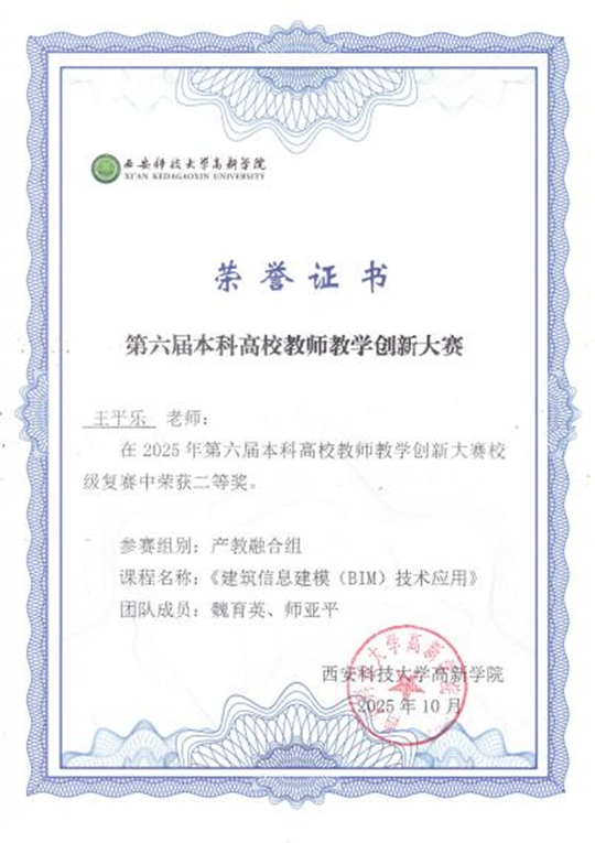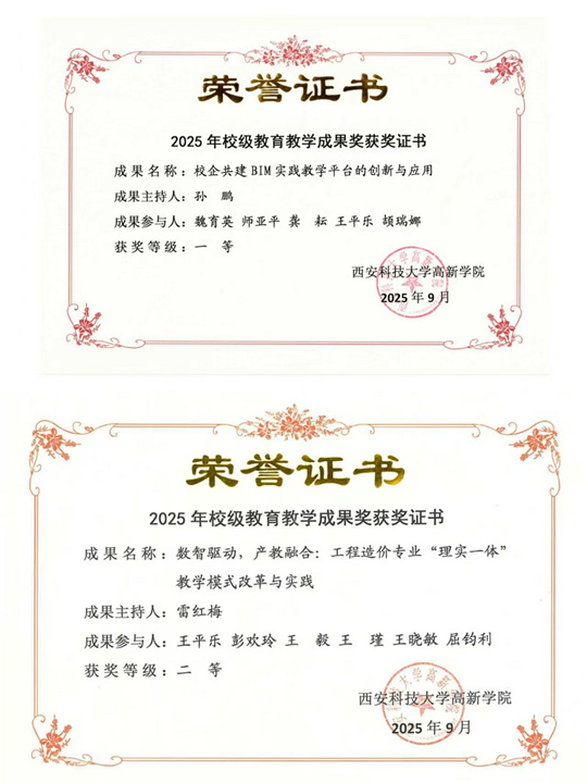 教学改革持续深化,创新成果亮点纷呈。在2025年校级教育教学成果奖评选中,科技与工程学院牵头完成的“校企共建BIM实践教学平台的创新与应用”荣获一等奖,“数智驱动,产教融合:工程造价专业‘理实一体’教学模式改革与实践”斩获二等奖,集中体现了学院在BIM实践教学平台构建、课程体系优化、理实一体化改革等方面的深入探索与显著成效。在第六届本科高校教师教学创新大赛中,王平乐老师领衔、魏育英、师亚平参与的《建筑信息建模(BIM)技术应用》课程,凭借鲜明的产教融合特色与创新的教学方法,荣获产教融合组二等奖,进一步印证了学院BIM课程建设的高水平与教学创新的持续突破。