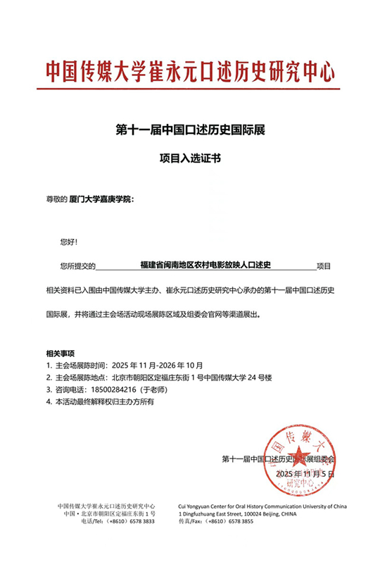 近日,从第十一届中国口述历史国际展传来喜讯,由厦门大学嘉庚学院人文与传播学院广播电视学专业林筠教授指导,学生邢蔓钰、唐佳硕、范乐琪、赵美祺创作的口述历史纪录片《余温》(即《福建省闽南地区农村电影放映人口述史》项目)经过激烈角逐,成功入围最终展映环节。