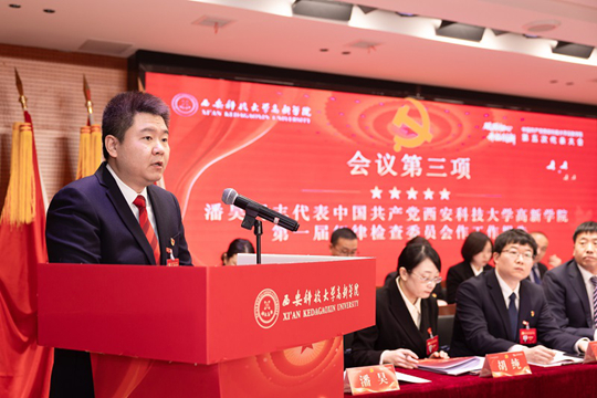 潘昊同志代表中国共产党西安科技大学高新学院第一届纪律检查委员会,向大会作《夯实全面从严治党和党风廉政建设主体责任 为学院高质量发展提供坚强政治保障》工作报告,系统总结了学院在压实全面从严治党责任、构建“不敢腐、不能腐、不想腐”长效机制、营造风清气正育人环境方面的实践与成果。