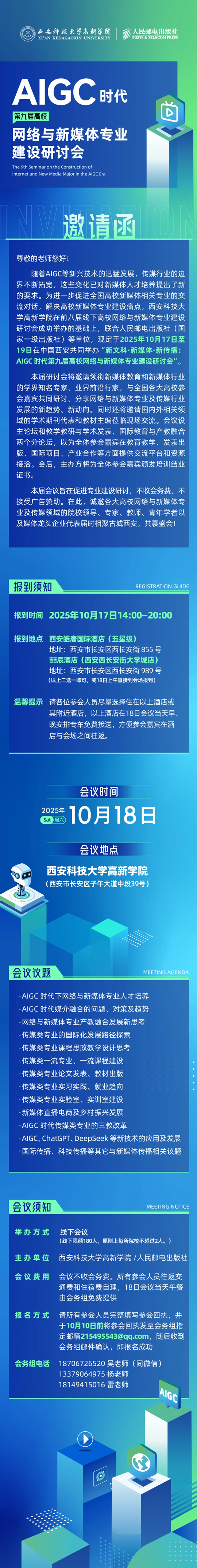为破解这一时代课题,2025年10月17日至19日,西安科技大学高新学院联合人民邮电出版社等权威机构将共同主办“新文科·新媒体·新传播:AIGC时代第九届高校网络与新媒体专业建设研讨会”。