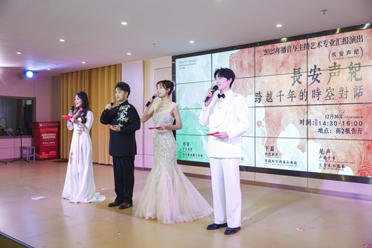 当聚光灯照亮西安科技大学高新学院的剧场舞台,一场以“长安声纪”为主题的播音与主持艺术专业汇报演出精彩启幕。这不是一场单纯的文艺展演,而是课堂教学成果的集中检阅,是实践教学反哺专业育人的生动课堂,更是高新学子以声音为媒、传承长安文脉的青春宣言。“播音与主持不仅是技术的艺术,更是思想的艺术。今夜,让我们共同见证,年轻的声音如何跨越千年,触摸一座城市永恒的灵魂。”演出伊始,经济管理与传媒艺术学院常务副院长李文教授的致辞,为整场演出赋予了超越期末展示的深刻立意,点明了学院培养“以声音承载文化的卓越传播者”的育人目标。演出分为“历史回响”与“现代新声”上下两篇,将专业课堂所学转化为兼具艺术性与思想性的舞台呈现,让实践教学的成果在舞台上熠熠生辉。