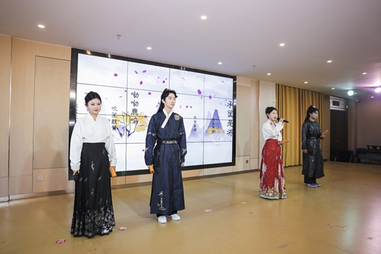 在“历史回响”篇章,学生们将《播音创作基础》课程中的“内三外四”基本功,转化为生动的舞台叙事。集体朗诵《长安,我们来了》气势恢宏,字正腔圆的表达里,是新时代传播者主动叩响历史与文明大门的专业信念;《长安诗笺》中,七位学子化身诗人与过客,用声音演绎李白的豪放、杜甫的沉郁、王维的空灵,让千年诗词在舞台上重新“呼吸”;《繁花》以肢体语言勾勒盛世长安的绚烂画卷,将大唐自信开放的时代精神融入当代青年的舞姿;《长安会客厅》创新采用历史人物访谈形式,考验学生即兴口语表达与历史人文素养的融合能力;《敕勒歌》的悠远旋律,是对多元文化交汇长安的历史致敬;《城砖的秘密》更创造性实践“声音考古学”,五位学子以精妙的声音设计构建考古现场声景,带领观众潜入时空深处,生动诠释了“文化承载者”的角色定位。