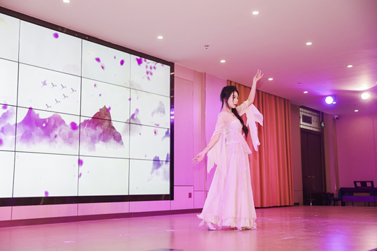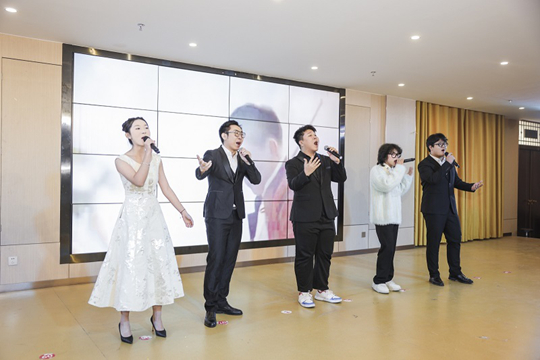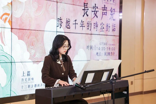 转向“现代新声”篇章,演出凸显专业教学的现代面向与跨界融合,展现实践教学对课堂内容的拓展与延伸。配音秀《“景”然如此》中,师生携手以声造景、用音塑情,将“声音即场景”的课堂理念转化为鲜活的舞台实践;钢琴独奏《彩云追月》灵动悠扬,在琴键上完成中西文化的巧妙对话;大合唱《相亲相爱》温暖和声汇聚全场情感,将“声越千年,长安永不落幕”的主题升华,也凝聚起师生同心、教学相长的育人力量。