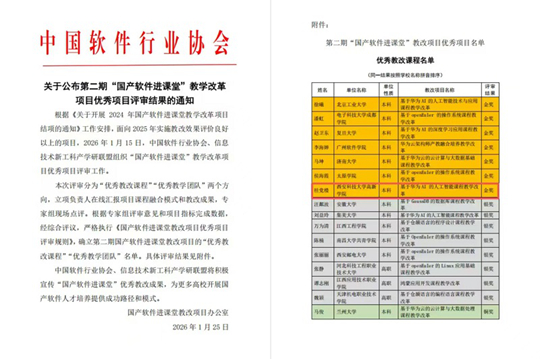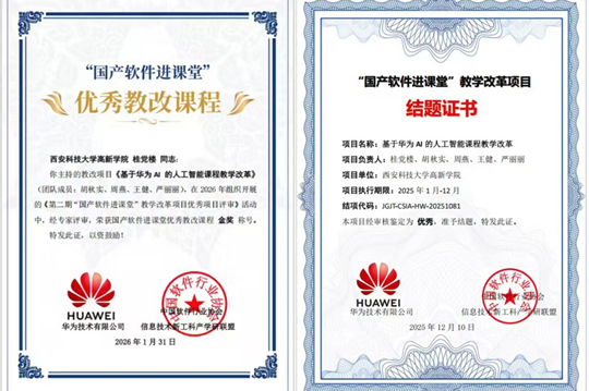 近日,中国软件行业协会、信息技术新工科产学研联盟联合公布第二期“国产软件进课堂”教学改革项目评审结果,西安科技大学高新学院桂党楼老师团队主导的《基于华为AI的人工智能课程教学改革》项目凭借突出的创新性、扎实的实践成效与显著的育人价值,荣获优秀项目金奖,成为全国高校产教融合与课程改革的典范之作。