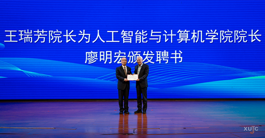 王瑞芳为人工智能与计算机学院院长廖明宏颁发聘书,并与廖明宏共同为人工智能与计算机学院揭牌。
