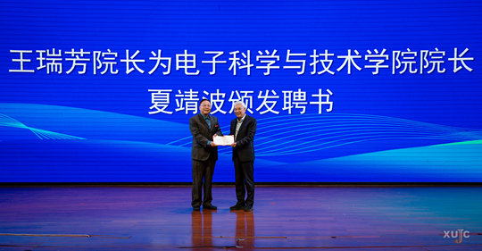 王瑞芳为电子科学与技术学院首任院长夏靖波颁发聘书,并与夏靖波共同为电子科学与技术学院揭牌。