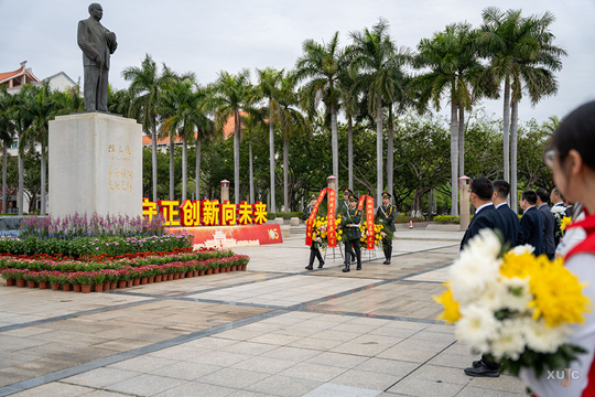 仪式上,李军、江顺代表厦门大学,杨云良、叶志筑代表嘉庚学院,共同向陈嘉庚先生铜像敬献花篮。