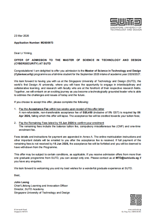 新加坡科技设计大学(SUTD)由新加坡政府与麻省理工学院(MIT)合作创办,是一所以工程技术与设计创新深度融合为特色的研究型大学。此次李一鸣同学录取的两个专业,均面向数字技术核心领域,对申请者的专业基础、实践能力及综合素养要求较高,双录取的取得,充分体现了学生扎实的学术能力与良好的发展潜力。
