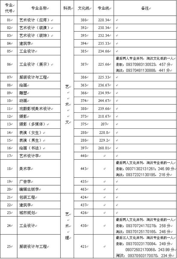山东工艺美术学院2009省内本科各专业录取分数线