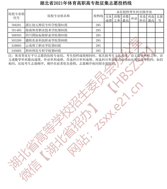 湖北省2021年体育高职高专批征集志愿投档线