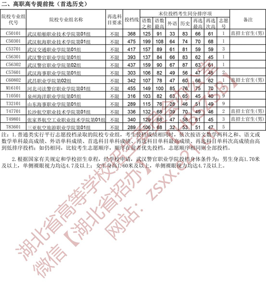 湖北省2021年高职高专提前批征集志愿投档线