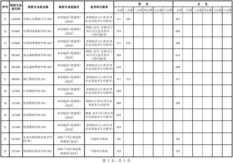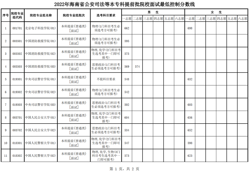 2022年海南省公安司法等本专科提前批院校面试最低控制分数线