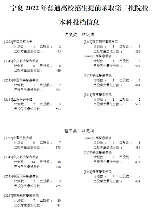 宁夏2022年普通高校招生提前录取第二批院校本科投档信息