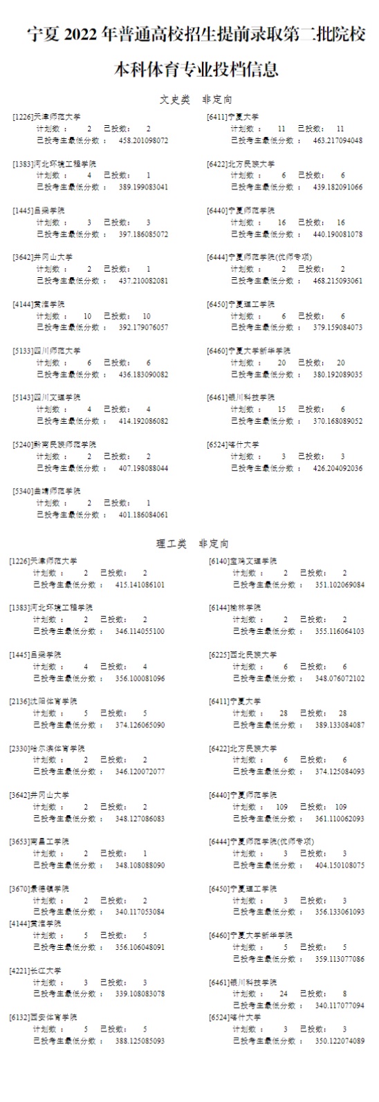 宁夏2022年普通高校招生提前录取第二批院校本科投档信息