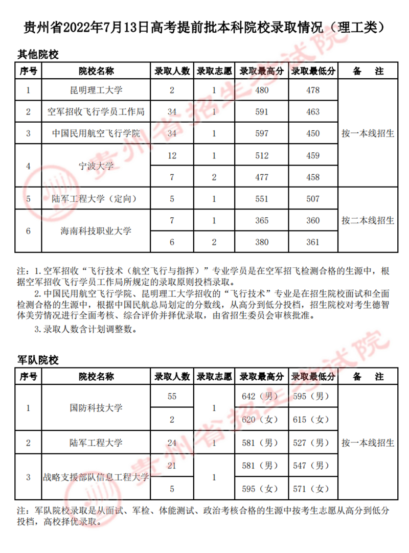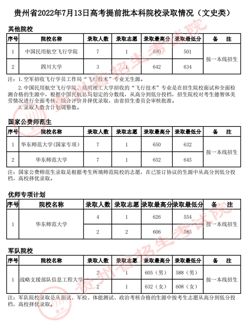 贵州:2022年7月13日高考提前批本科院校录取情况