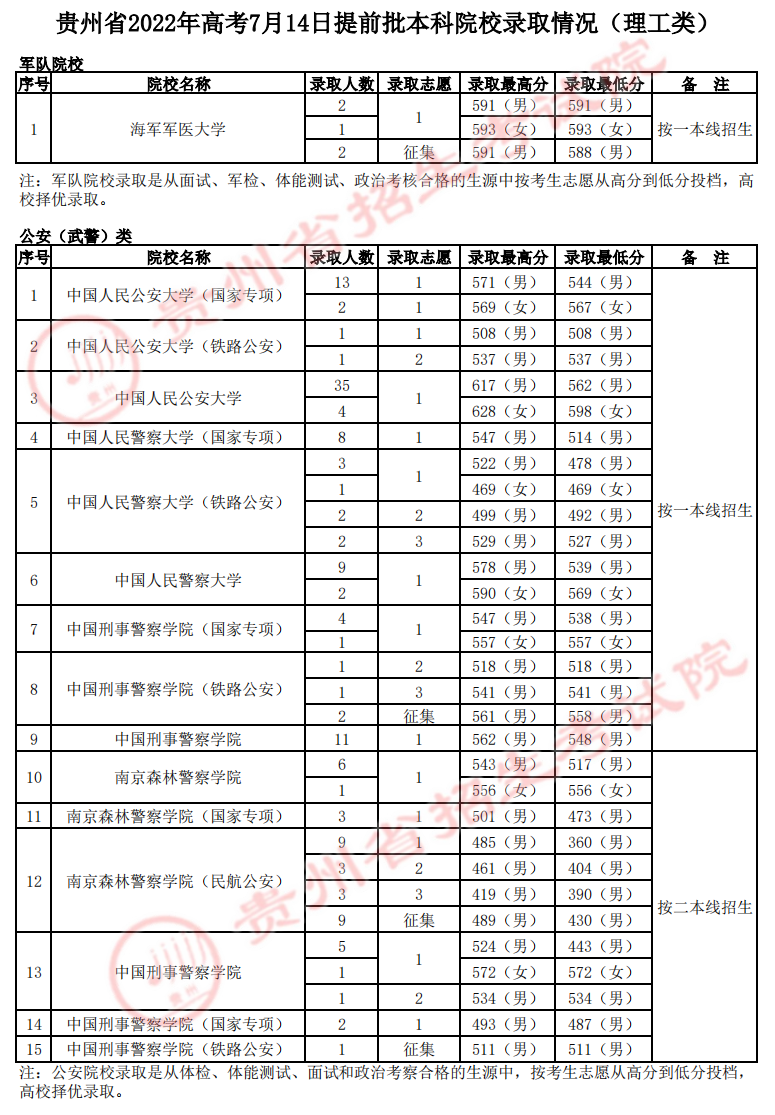 贵州:2022年高考7月14日提前批本科院校录取情况