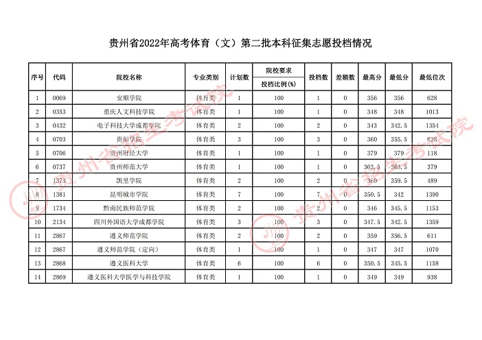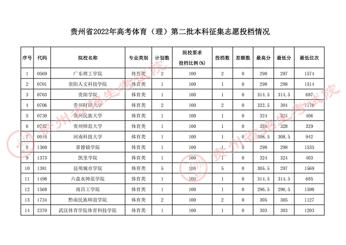 贵州省2022年高考体育第二批本科征集志愿投档情况