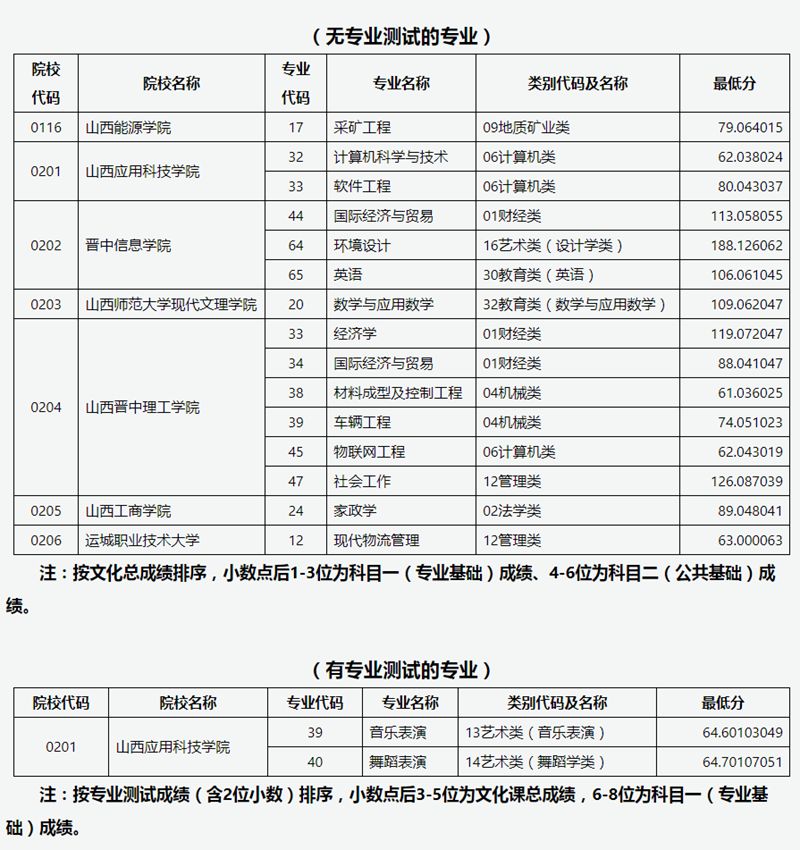山西省2022年普通高校专升本选拔考试建档立卡专项批院校征集志愿公告(三)投档最低分