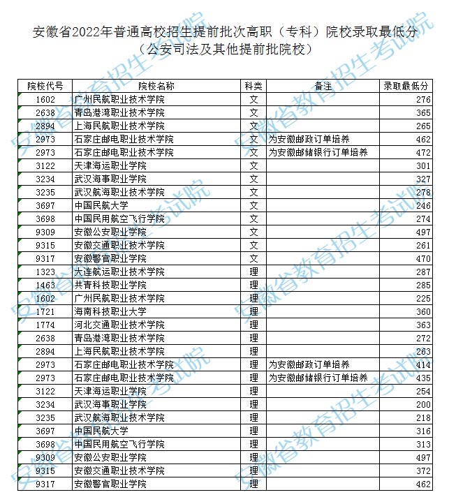 安徽省2022年普通高校招生提前批次高职(专科)院校录取最低分(公安司法及其他提前批院校)