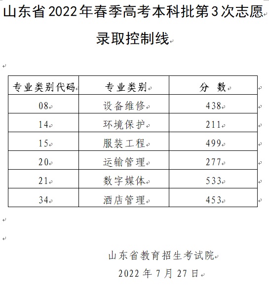 山东省2022年春季高考本科批第3次志愿录取控制线