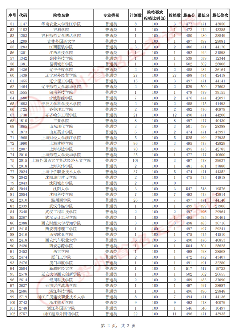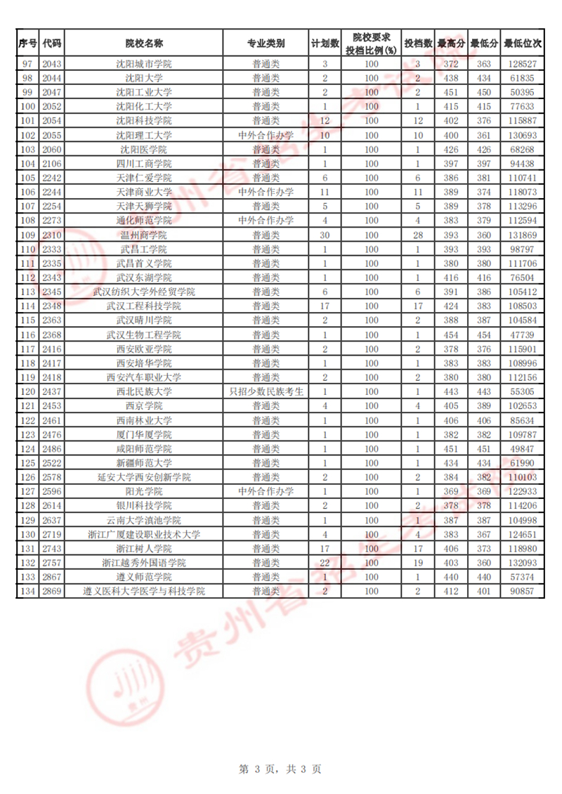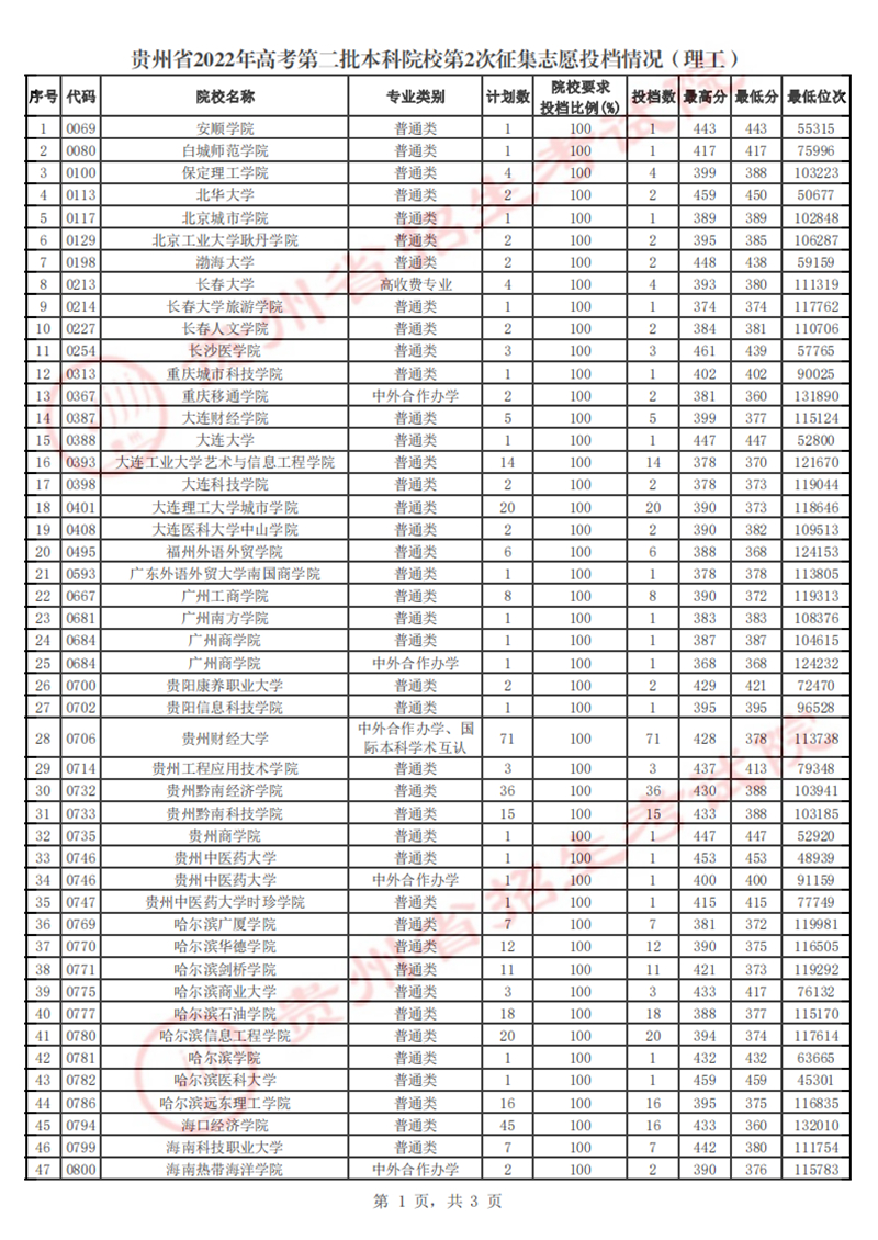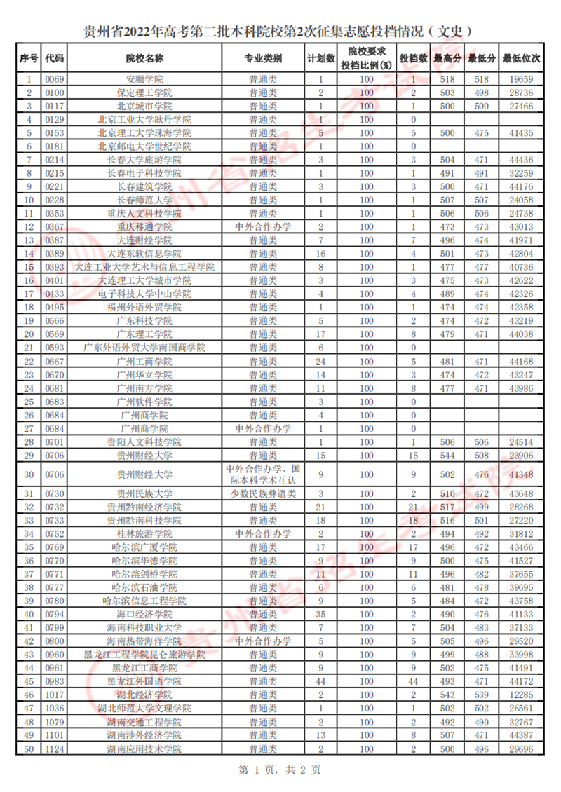 贵州省2022年高考第二批本科院校第2次征集志愿投档情况