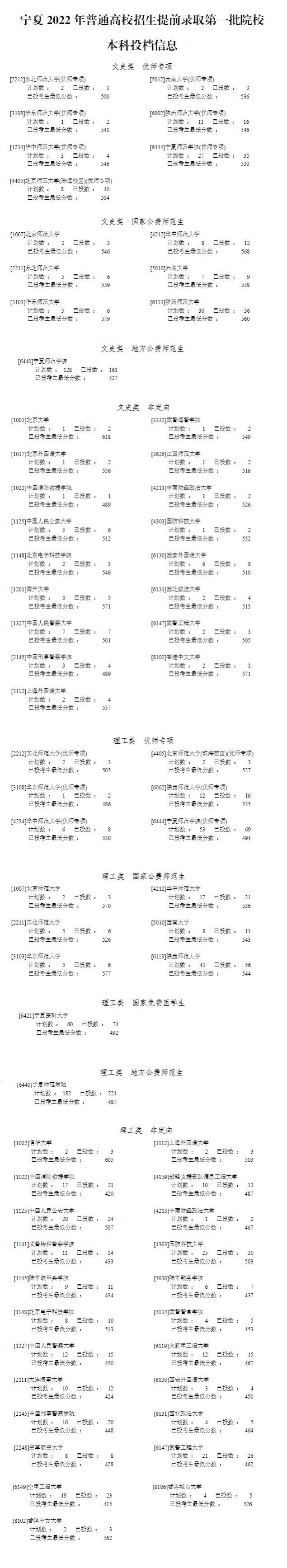 宁夏:2022年普通高校招生提前录取一本投档信息