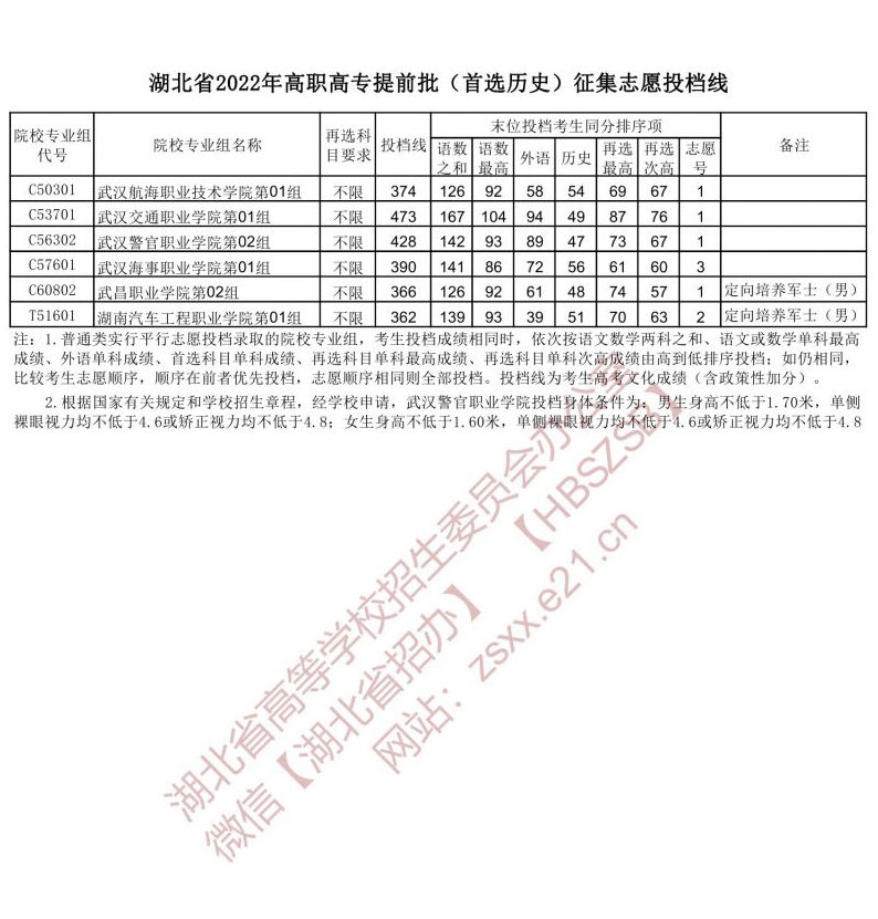 湖北省2022年高职高专提前批(首选历史)征集志愿投档线