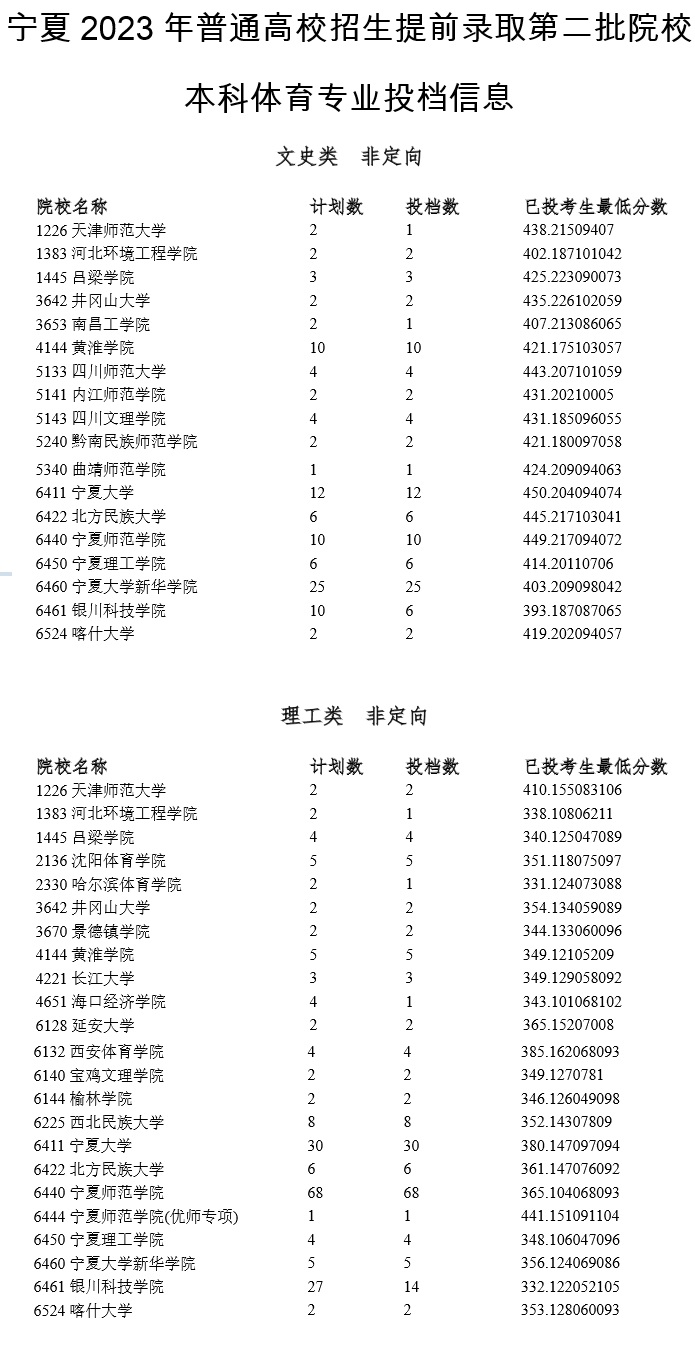 宁夏:2023年普通高校招生提前录取第二批院校本科体育专业投档信息