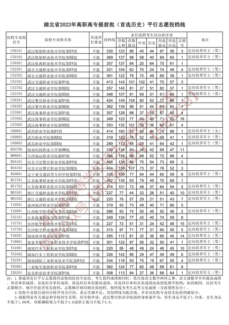湖北省2023年高职高专提前批(首选历史)平行志愿投档线
