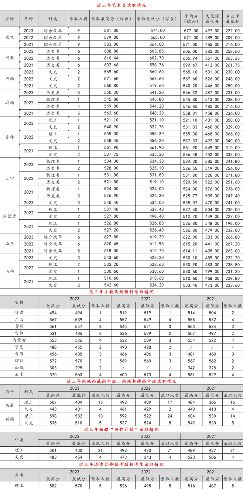 北京科技大学近三年艺术类、少数民族预科、新疆协作计划、内地新疆高中班、内地西藏高中班等特殊类型录取情况(2021-2023)