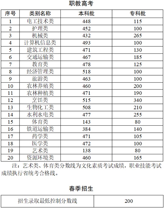云南省2026年职教高考、春季招生录取最低控制分数线