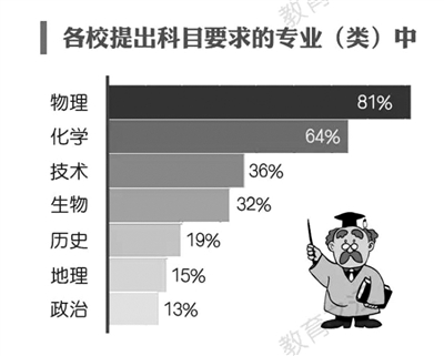 除掉没提要求的500多所高校(主要是一些省外高校,如一些独立学院、民办院校、高职院校等),其他各校提出选考科目要求的专业(类)中,选择最多的是物理,涉及设限专业(类)的81%,其次是化学涉及64%,再次是技术涉及36%,此外,生物、历史、地理、政治分别涉及32%、19%、15%、13%。