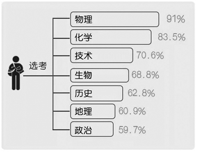 如果把所有高校一起计算,其中包括500多所没有设置选考要求的高校,那么考生选考物理即可报考(包括高校设限选考科目为物理或没有设限选考科目)91%的专业(类),化学达到83.5%,技术达到70.6%,生物达到68.8%,历史达到62.8%,地理达到60.9%,政治达到59.7%。