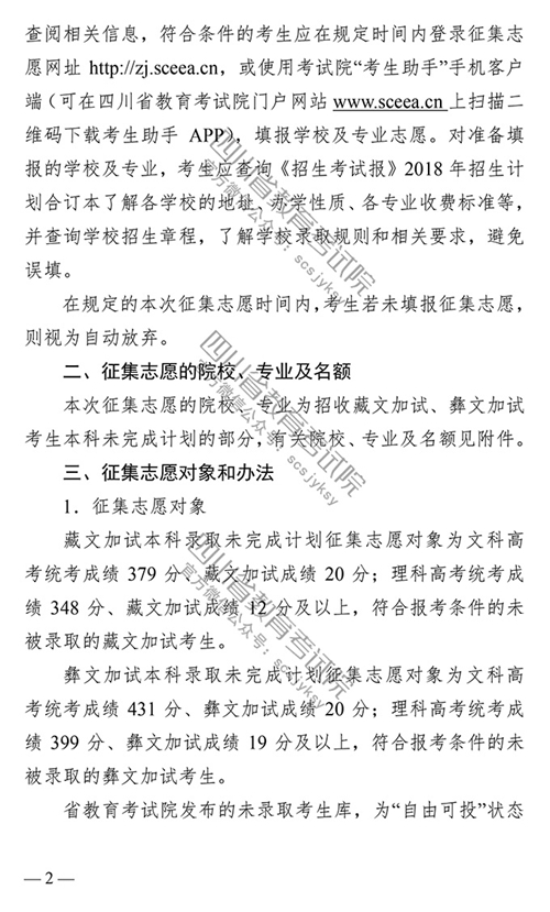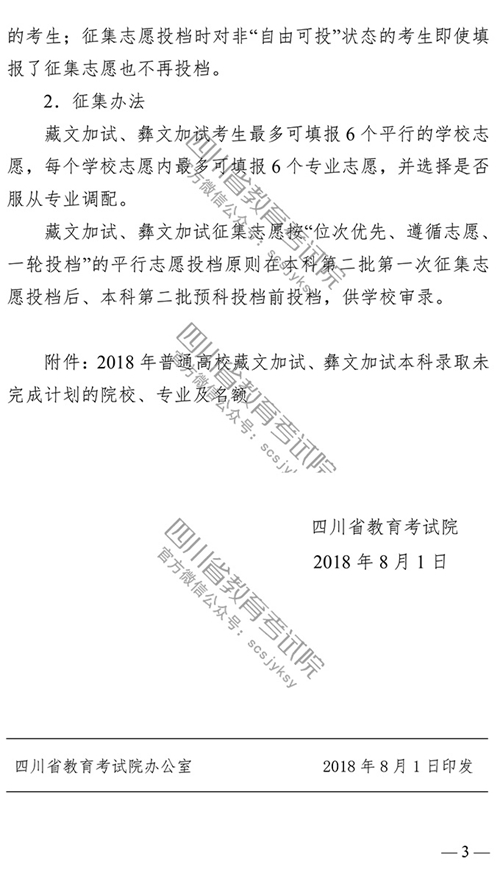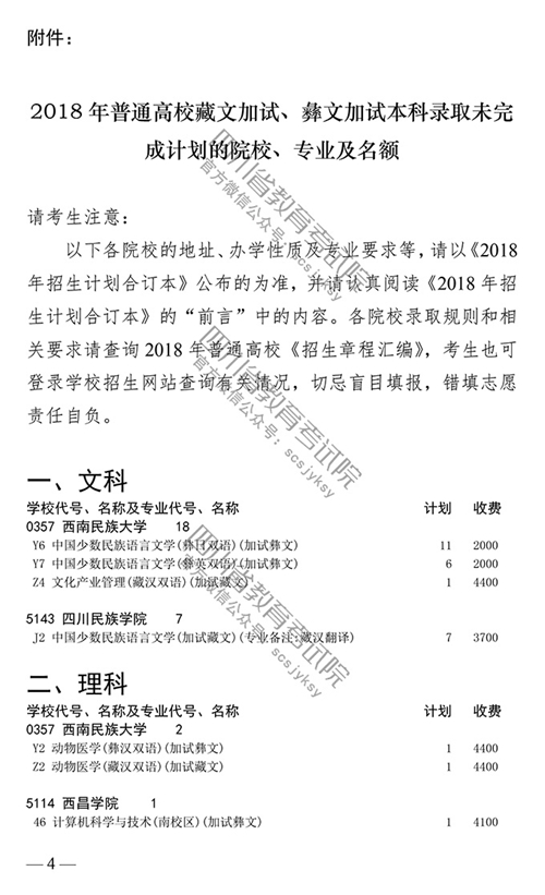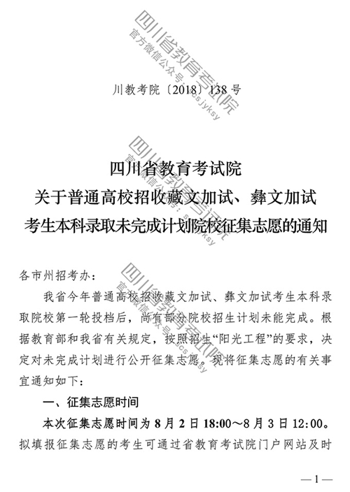 四川:关于普通高校招收藏文加试、彝文加试考生本科录取未完成计划院校征集志愿的通知