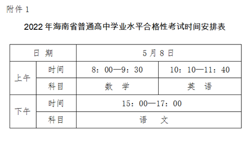 为了保障广大考生和考试工作人员的生命安全和身体健康,结合当前我省疫情防控形势,经研究决定,原定于2022年4月9日在海口市第二中学举行的2022年海南省普通高中学业水平合格性考试语文、数学、英语三个科目的考试时间推迟到5月8日举行。考试地点:海口市第二中学,具体考试时间安排见附件。