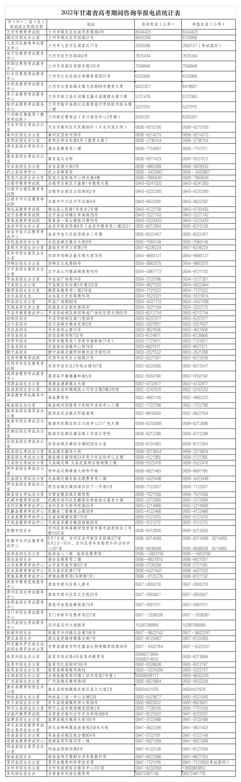 2022年甘肃省普通高考各市州县区咨询举报电话