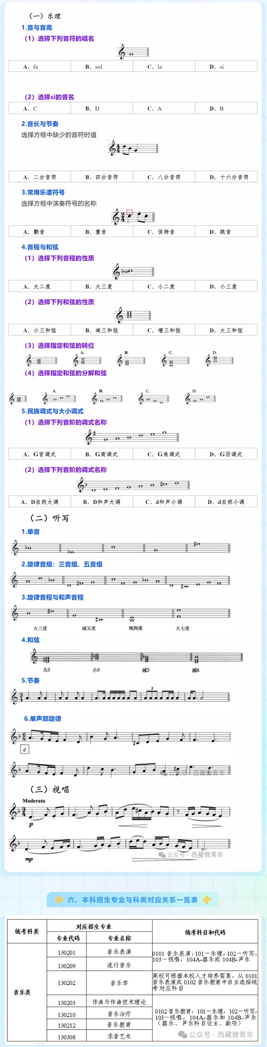 考试内容:音与音高、音长与节奏、常用乐谱符号、音程与和弦、民族调式与大小调式。
