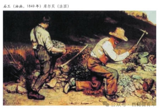 请以法国现实主义画家库尔贝的《石工》为构图和人物造型、道具细节的参考,置换人物身份、服装、道具及环境,画一张新版本的《工作的人》。