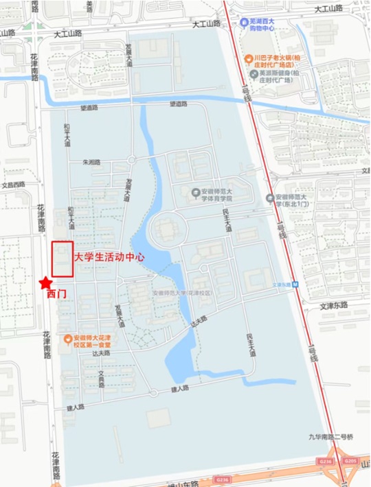 从安徽师范大学花津校区西门(花津南路)进入到达考试区域最为便捷,从其他校门前往考试区域,请务必预留充足的交通时间。