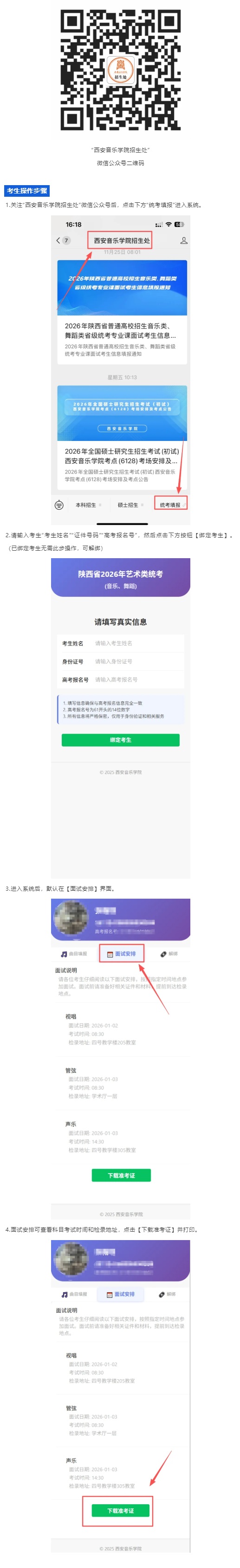 2026年陕西省普通高校招生音乐类、舞蹈类省级统考将于2026年1月2日—4日在西安音乐学院(西安市雁塔区长安中路108号)举行,完成信息填报的考生须于2025年12月25日10:00—2026年1月2日18:00,通过已关注的“西安音乐学院招生处”微信公众号,在“统考填报”系统自行下载打印统考专业课面试准考证。按照统考专业课面试准考证上规定的时间,携带本人身份证和音乐类、舞蹈类省级统考专业课面试准考证参加相关科目考试。