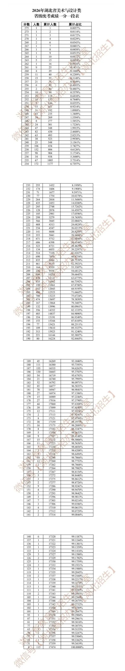 2026年湖北省美术与设计类省级统考成绩一分一段表