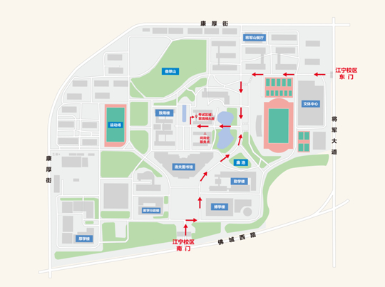 考生须从东门或南门进入,地址南京市江宁区佛城西路8号(河海大学江宁校区)。