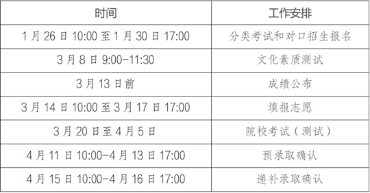 分类考试和对口招生“报名”和“志愿填报”分阶段进行,即符合报名条件的考生网上报名后,参加全省统一组织的文化素质测试,成绩公布后再填报院校与专业志愿。所有报名参加分类考试或对口招生的考生均编排文化素质测试考场,符合免文化素质测试条件的退役军人等考生,可自行决定是否参加文化素质测试。