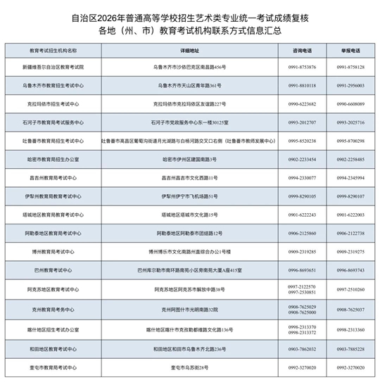 成绩复核程序:成绩复核工作由新疆教育考试院统筹实施。各地(州、市)教育考试机构具体负责属地考生成绩复核工作(按照复核流程相关要求,新疆教育考试院不直接接受考生个人复核申请)。申请成绩复核的考生自行下载并填写《自治区2026年普通高等学校招生艺术类专业统一考试成绩复核申请表》(附件1),于1月27日至29日向生源所在地(州、市)教育考试机构提出成绩复核书面申请,逾期不再受理。复核结果由各地(州、市)教育考试机构向考生反馈。