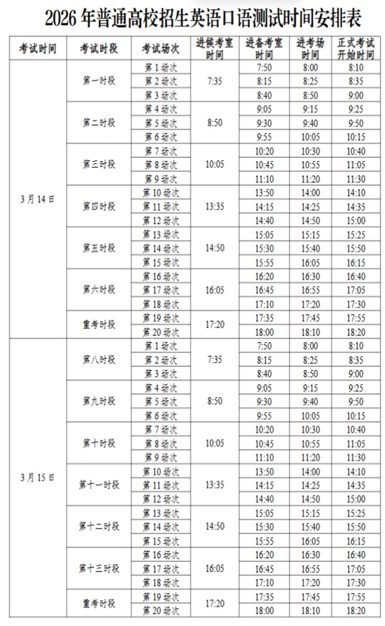 二、考试时间和地点英语口试时间为2026年3月14日至15日,考试场次及具体时间安排见《英语口试时间安排表》(附件1)。考生的候考入场时间和考试地点以准考证上的安排为准,请准时赴考,遵守考试相关要求。