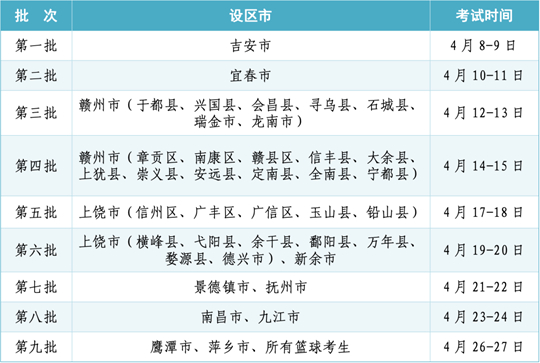 注:第1-8批次全部为足球考生,第9批次为鹰潭市、萍乡市足球考生和所有篮球考生,所有缓考均安排在第9批次进行。4月16、25日休息。
